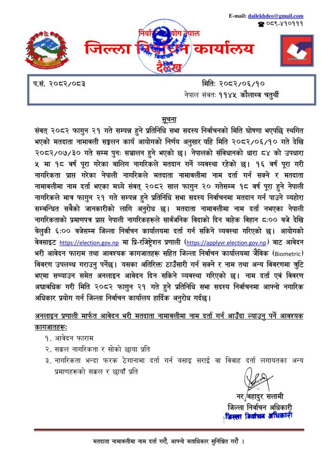 जिल्ला निर्वाचन कार्यालय दैलेखको सूचना ।।